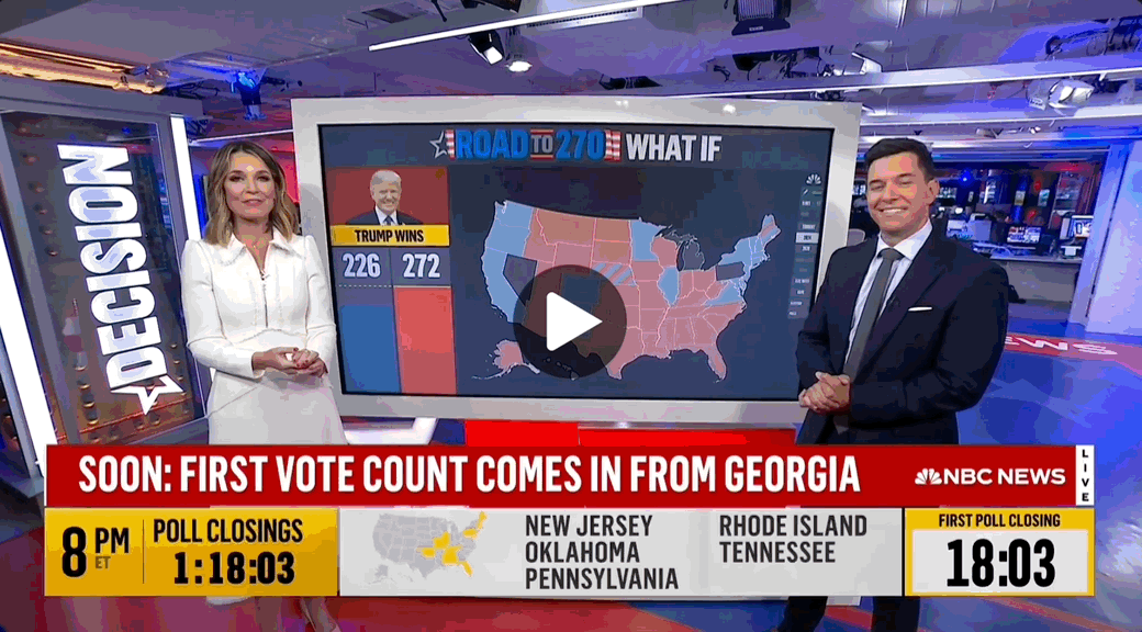 Immersive virtual set extensions and full virtual environments to showcase results throughout election coverage for both national NBC network coverage and MSNBC.